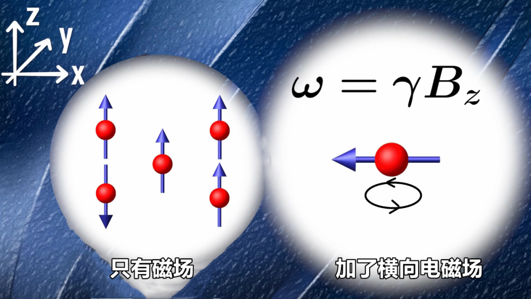 如果将原子核放入与时间无关的磁场中,它就会有一种特定的共振频率。这种频率取决于原子核的类型,以爱尔兰物理学家约瑟夫·拉莫尔命名,称为拉莫尔频率。原子核在磁场中一般是不旋转的,但如果我们再让电磁波以正确的共振频率穿过原子核,那么原子核将吸收电磁波的能量,开始旋转起来。