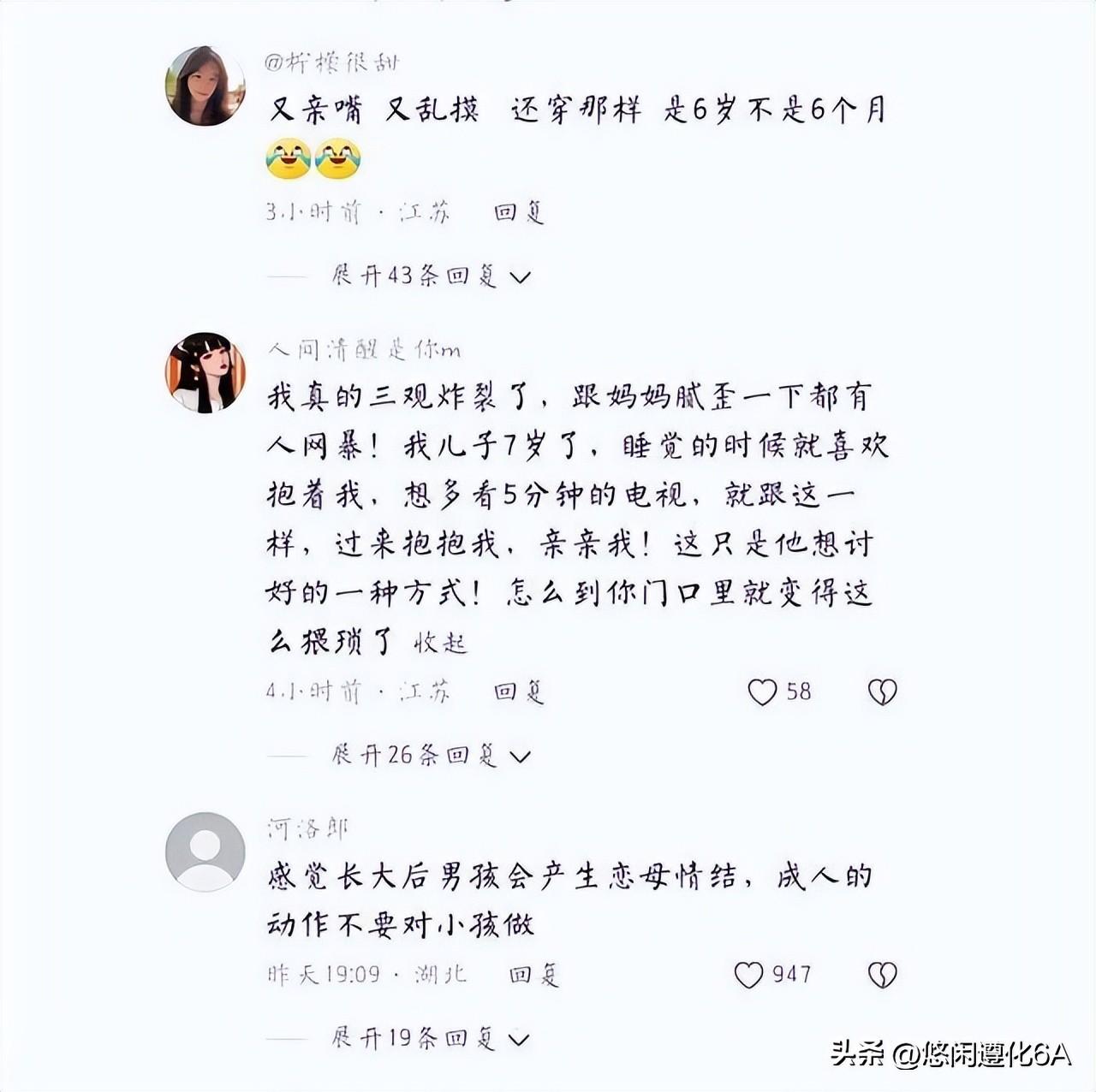 还有的说“这个孩子只有六岁,不要心里脏看什么都脏。”“没孩子的请别说话,心脏的请自觉离开。”“我也有自己的儿子,没觉得这样和自己的孩子这样接触有什么不好的。”