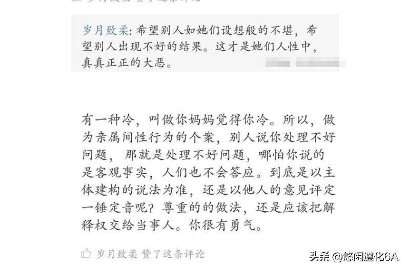 “岁月至柔”是一位单亲妈妈,她在自己发布的文章中称自己是一位喜欢思考的独立女性,在看到关于母子性后开始了思考,在翻阅资料后,说自己找不到理由不去尝试。在此我很不能理解,究竟是什么样的思想能够说出自己找不到理由去尝试。