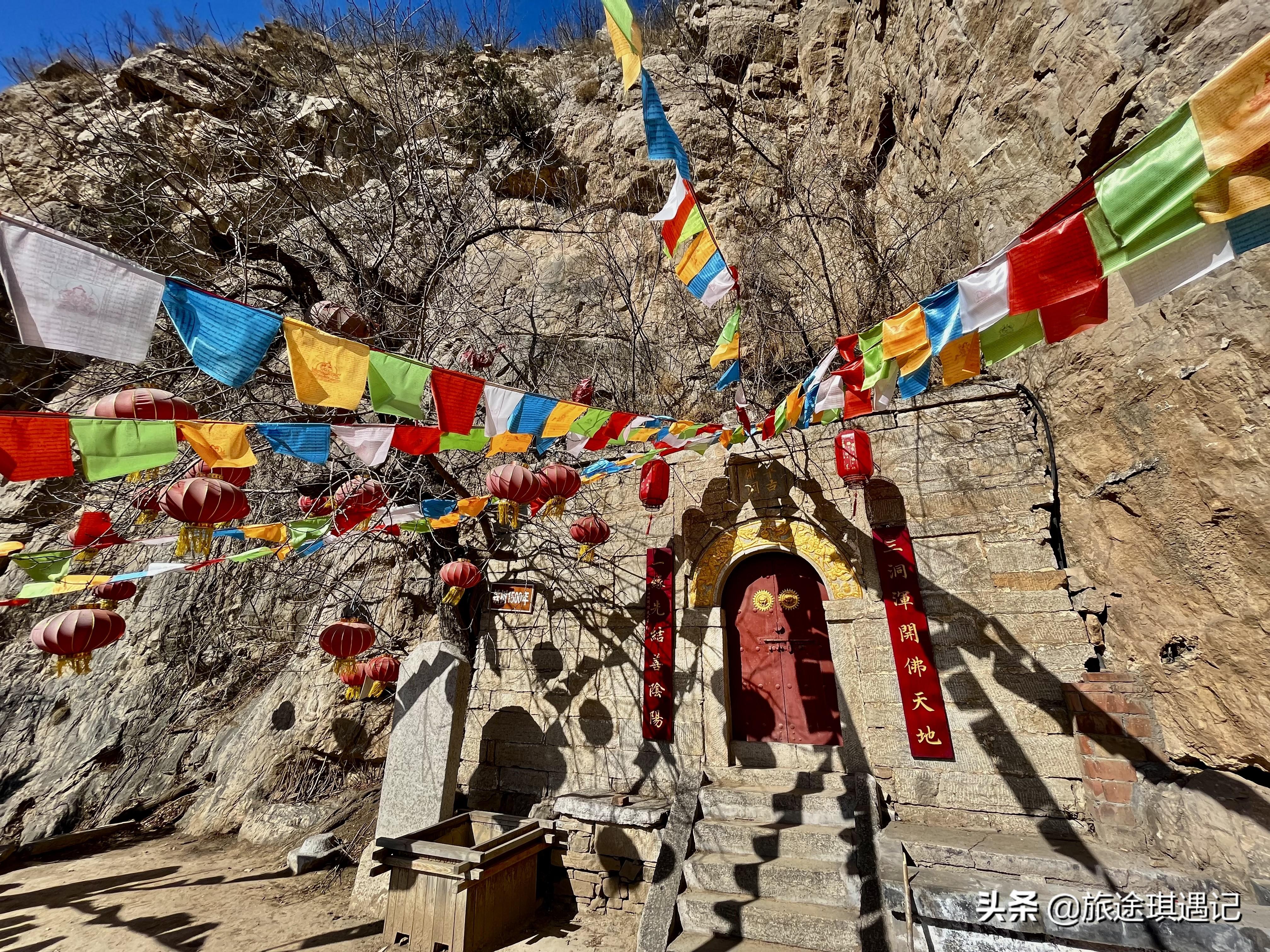 从太行天路走到202省道,也可以直接导航千佛寺,这个景点就在路边有很明显的路标指示。来到景区的小院里停好车,我们一抬头就能看到山腰处的寺庙。