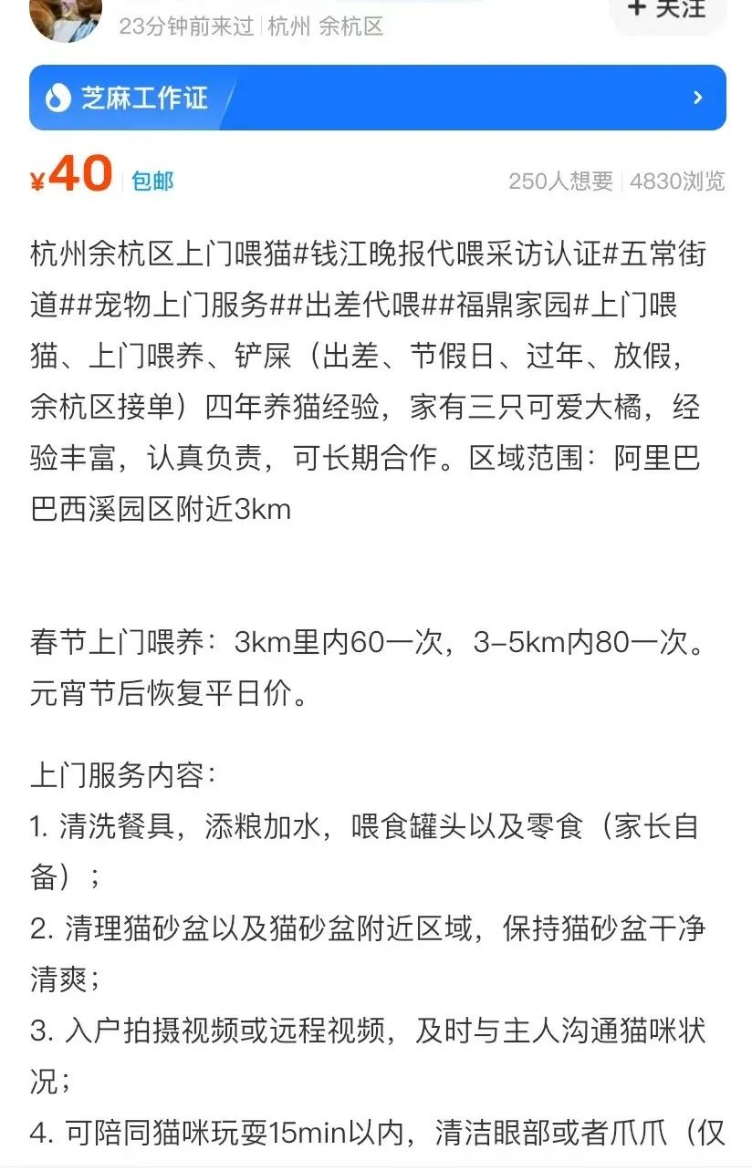 留杭继续接单做上门喂养服务。”